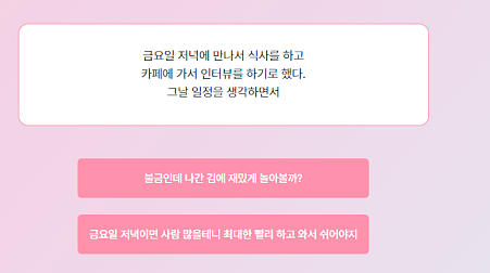 예를 들어, 친구가 인터뷰를 도와달라고 부탁했을 때 "어떤 인터뷰인데?"라고 물어보며 상황을 파악하려 할지, 혹은 "도와줘도 되는 거야?"라고 하며 먼저 도움의 의지를 보일지 선택하게 됩니다. 이러한 방식으로 나의 성향과 대처 방식을 알아가는 것이죠.