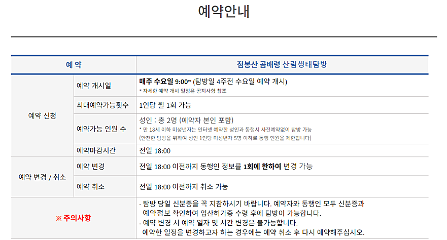 - 본인과 동행자 모두 신분증을 지참하고, 입산허가증을 수령 후 탐방할 수 있습니다.